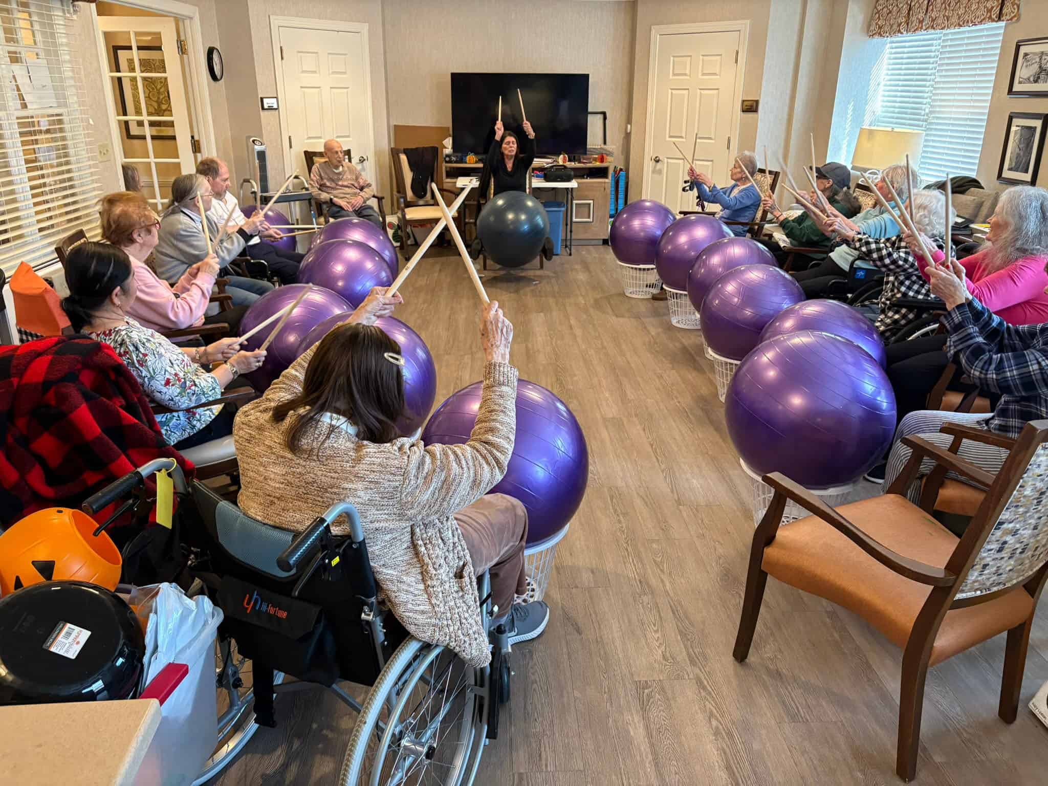 Twice a month, our music drumming program fills the activity room with rhythm, laughter, and energy. Residents use large exercise balls and drumsticks to follow guided beats that blend movement and music in a fun, therapeutic way. The experience is upbeat, engaging, and accessible to residents of varying physical abilities.